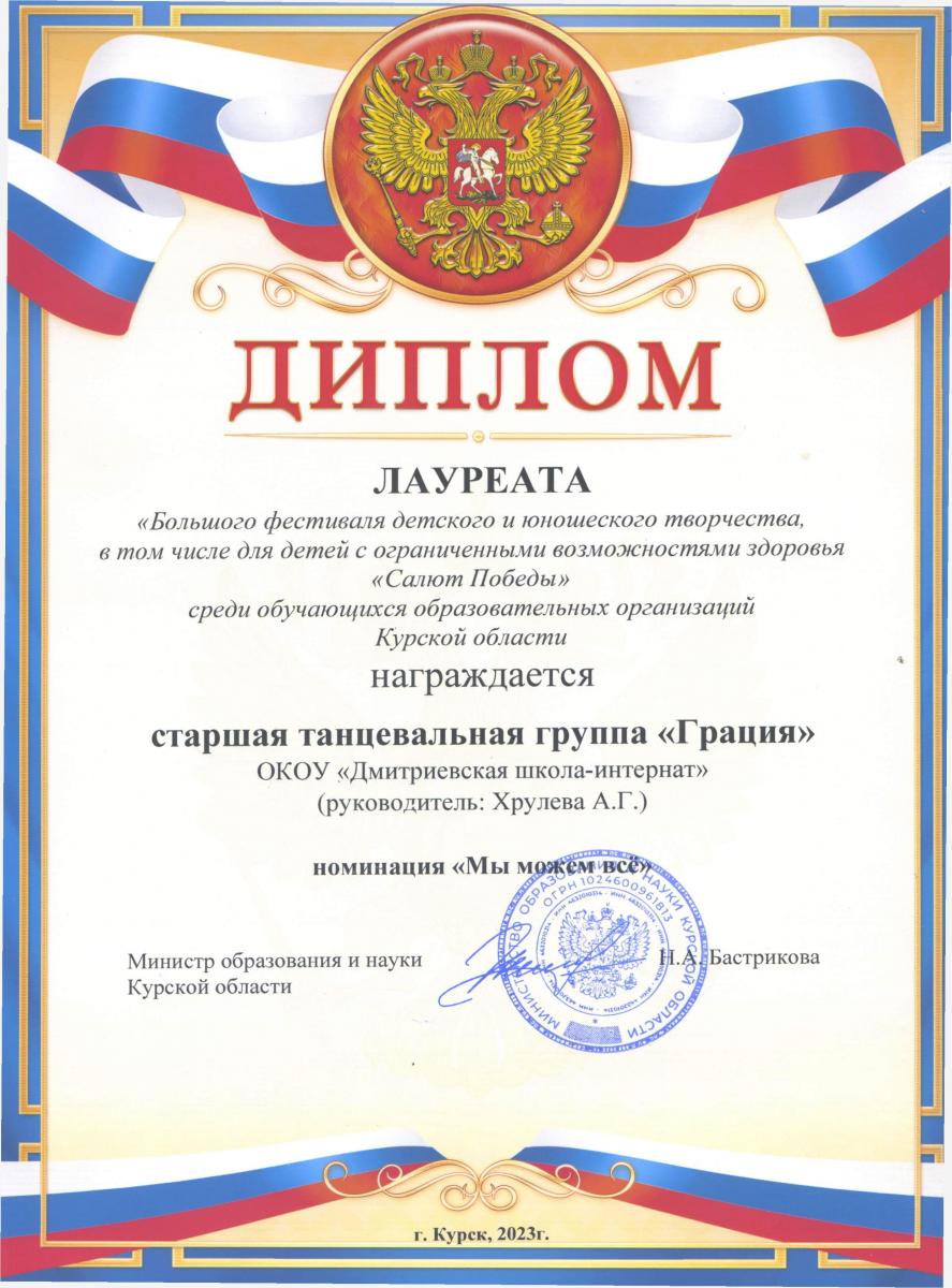 Диплом Лауреата Большого Фестиваля детского и юношеского творчества "Салют Победы" (старшая танцевальная группа "Грация" руководитель А.Г. Хрулева)